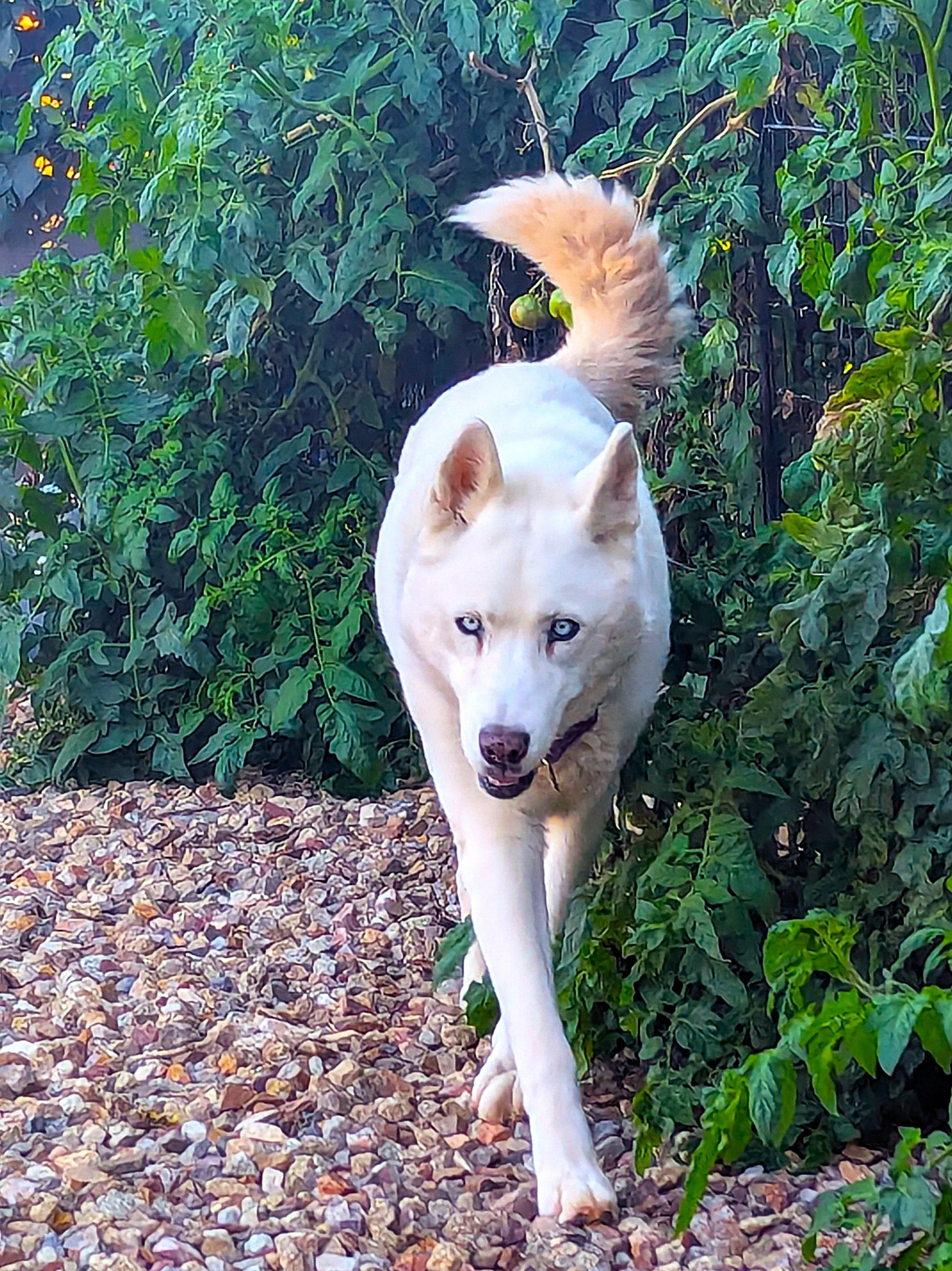 Nikki came to live with us last May after a friend’s battle with health issues made it impossible for him to take care of a dog. The transition has been hard on all of us. Nikki, a twelve-year-old Siberian Husky, was never socialized. Our lives were turned upside down when we learned she couldn’t be around other animals, as her strong predator response led to biting our dogs and cornering the cats. To keep everyone safe, we surrendered our backyard and my office for her needs, leaving our dogs without a place to bask in the sun or to do their morning business. While Nikki seeks cover among my tomato plants, Ron and I walk the other dogs three or four times a day.